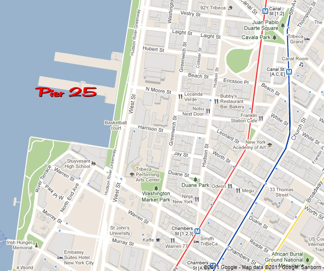 Pier 25 is located by the West Side Highway between North Moore St. and Harrision St. It's the first Pier north of Battery Park City. Closest subways are or Canal or Franklin Sts. on the 1 train (or Chambers on the 1,2,or 3) or Canal St. on the A,C or E.